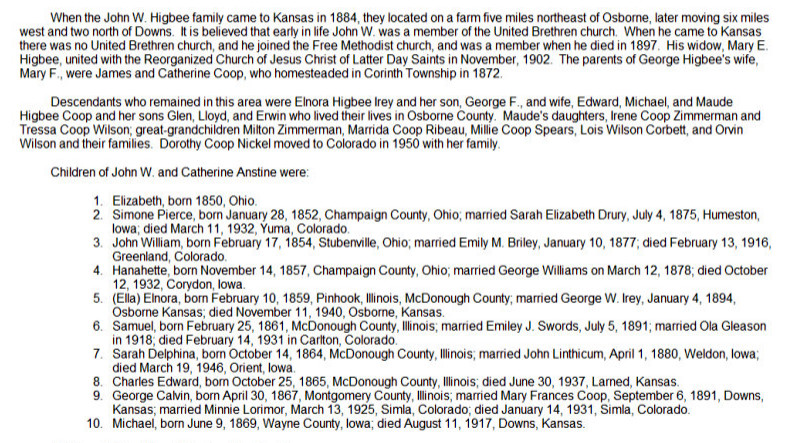 In 1910 Smith County, Kansas, Worthy Higbee is farming, 34, born in Iowa, with partner Glick 26 born in Kanssa. Next household is S. P. Higbee 58 born in Ohio with S.E. 55 born in Indiana, married 34 years. SHe's had sevenkids, four living. John is 20, Nellie 18, both born in Kansas.