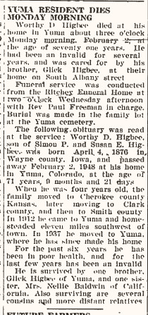 1945 "Glick Higbee spent Sunday in Denver visiting his brother, W.D. Higbee, a patient at Colorado General Hospital. Worthy is in a wheel