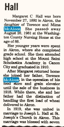 In 1920 Akron, Terence is 62 Mina 52, Anna L. 19. Margarte M. Hall 27 and Joseph L. Hall 26 are with them.