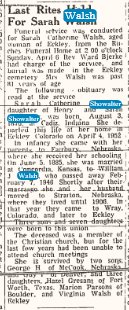 "Sarah Showalter Walsh, widow of the late W. J. Walsh of Eckley,