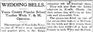 Halcie, 16, married George H. Buzick on Dec 28, 1912 in Yuma County.