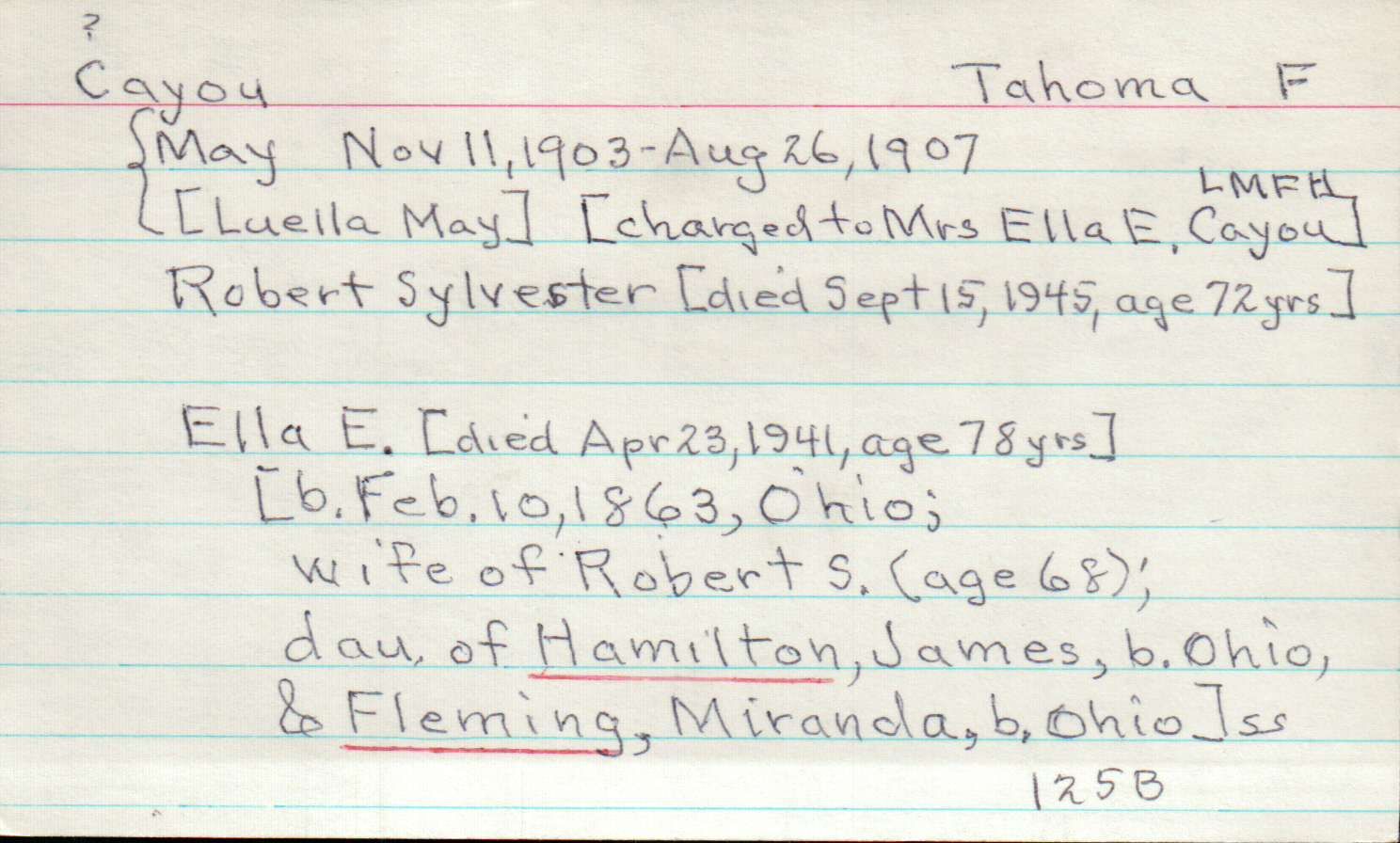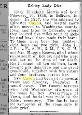 Clara Symmonds, 93, died Thursday, March 11, 1993, in the Highline Convalescent Center after an extended illness. She was born April 23, 1899, to Robert W. and Ella (Hamilton) Cayou at Yakima. She attended school in Yakima and worked there until her marriage to Bert Symmonds in September of 1920. They lived in Wapato and Toppenish until the Depression, when they moved to Selah, where Mr. Symmonds found work. They moved to Grand Coulee in 1936 and Mr. Symmonds worked on Grand Coulee Dam. They lived in Spokane from 1942 to 1947, then moved to Waitsburg. They lived in the Milton//Freewater, Ore. area, Walla Walla and Kansas before returning in 1973 to this area, where Mr. Symmonds opened an antique-clock repair business in East Wenatchee. Mrs. Symmonds is survived by two sons, Russell of Wenatchee and Mel of Ephrata; a daughter, Ellen R. Noll of Seattle; seven grandchildren; and a great-grandchild. She was preceded in death by her husband in 1976; two brothers, Robert and Frank Cayou; and a sister, Doris. |