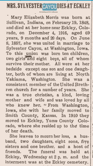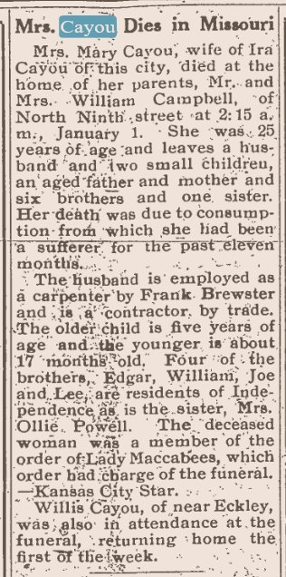 Loveland Reporter Herald Wednesday Feb. 25, 1981 page 8 Ray T. Cayou, 82, 730 N. Sheridan Ave., Loveland, died at home Tuesday. He was born Sept. 12, 1898 in Marseilles, Ill., to John and Lillie May Pitsonbarger Cayou. He married Altha M. Webb Aug. 7, 1923 in Denver. He moved to Loveland in 1956 from Denver. Cayou was a self-employed upholsterer for 50 years and retired in 1980. He was a member of the Eden Valley Seventh Day Adventist Church. He is survived by his wife Altha of Loveland; sons Alvin of Loveland and Mylo of Ventura, Calif.; brothers Erman Cayou of Canon City and Dewey Cayou of Denver; sister Violet Webb of Craig; six grandchildren; and five great-grandchildren. A service will be 10 a.m. Friday in Hunters’ Garden Chapel with Pastor Max L. Ritchie officiating. Interment will be in Loveland Burial Park. Alvin A. "Al" Cayou, 87, of Loveland, passed away March 16, 2012 at McKee Medical Center. He was born July 27, 1924 in Garden City, Kansas to Ray T. and Altha M. (Webb) Cayou. He graduated from Englewood High School and served in the U. S. Navy from February 1942 until December 1946 mostly in the Pacific, he was discharged as a Second Class Petty Officer. He re-enlisted in the Navy in February 1947 making it a career and was discharged after 20 years in December 1963 as a Chief Petty Officer. He married Myrna M. Lowe on June 20, 1928 in Englewood, CO. She preceded him in death on May 25, 1994. He worked at Hewlett Packard for 23 years, retiring as a senior buyer in July 1986. Al enjoyed volunteering with the House of Neighborly Service and making skinny books for the young children to read. He also enjoyed fishing and spending time at his cabin at Red Feather Lakes. He was a member of the Fleet Reserve Association and a life time member of DAV Post 32 and VFW Post 41 in Loveland. Al is survived by his children; Richard Cayou (Connie), Marylin Peatrowsky (Dave) and Leona Cayou all of Loveland; grandchildren Shad and Brandon Cayou (Michelle), Eric Peatrowsky (Kristy), Jana Rowland (Travis), Lisa Peatrowsky and Kyle Cayou; great-grandchildren Bryanna and Miranda Cayou; Caitlynn, Luke, and Emily Cayou; Everett, Weston, and Avalin Peatrowsky; Jason Rowland. Al is also survived by his cherished friend Shirley Mohler. He was preceded in death by his parents, Ray and Altha Cayou, his brother, Mylo Cayou and his wife Myrna. A visitation will be held Monday, March 19, 2012 from 5:00pm until 7:00pm at Allnutt Funeral Service. A funeral service will be held 2:00pm on Tuesday, March 20, 2012 at Allnutt Funeral Service. Interment Resthaven Memory Gardens in Fort Collins. |