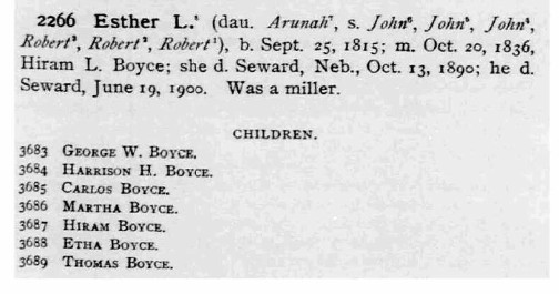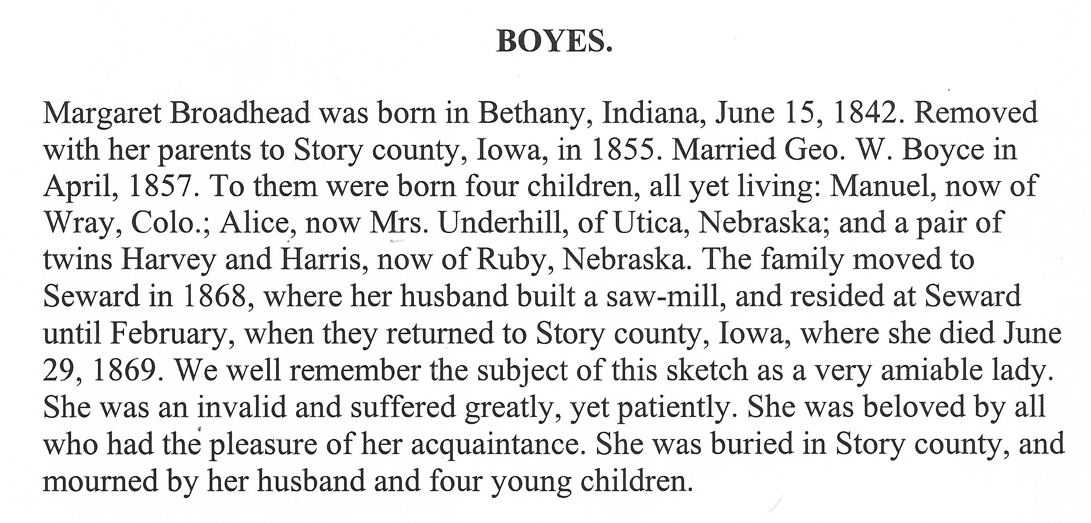 Mr. Boyes was married in 1836 to Esther L. Hibbard of Erie county, New York. In 1844 the young couple went to the wilds of Michigan and settled in St. Joseph county. In 1849 Mr. Boyes went to California, going around Cape Horn, spending four years in the mines. After returning home, the family removed to Story county, Iowa, and in 1867 came to Seward and he built the first mill in Seward, which waa a great convenience to the early settlers and has .... ever since. Mr. Boyes was a publicv spirited citizen and during his active business life. his full share in the development and advancement of Seward and Seward county, taking great interest in everything relaated to be of benefit to the city and county.