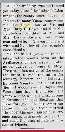 Harve has been clerk in that store for some time and now he becomes a partner. Frank Boyes is one of Yuma county's foremost young men and a thorough going business man.