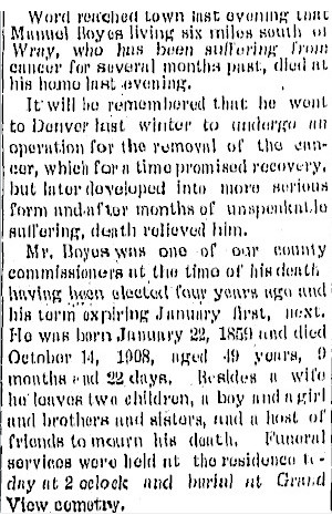 They made their home in west Wray until Mrs. Boyes died in 1941.