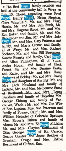January 1945 Eckley "Carl Engel and his sister, Mrs. Marie Newlan, have moved into the house in the east part of town formerly occupied by the Warnick famiy."
