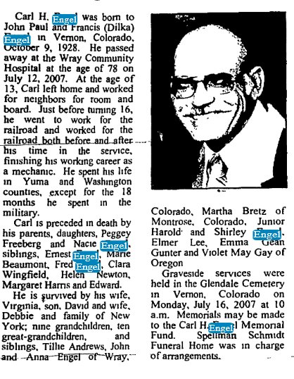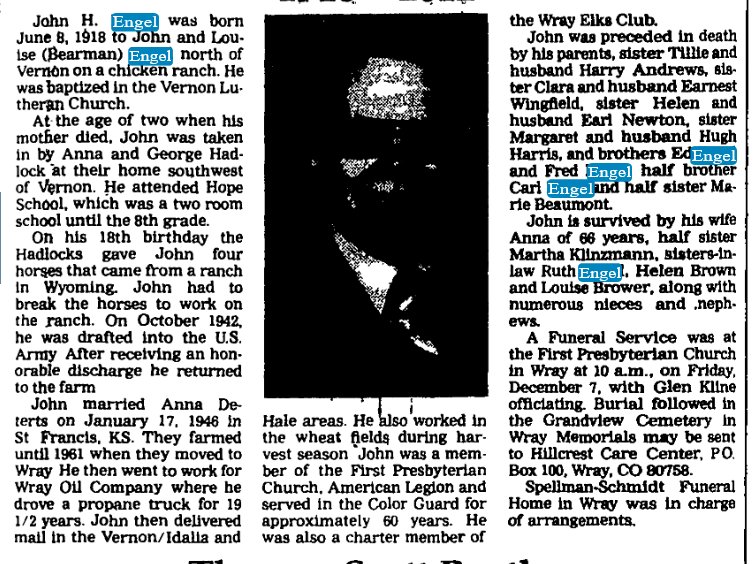 John H. Engel is buried in Wray 1918-2012, # 102074319.