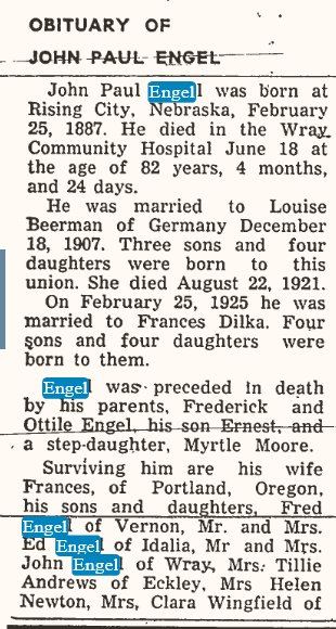 John Engle and Frances Dilka, both of Vernon, wee married by Judge I. L. Barker on Feb 25, 1925 at Wray.