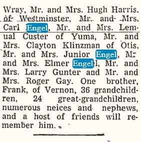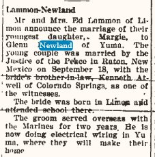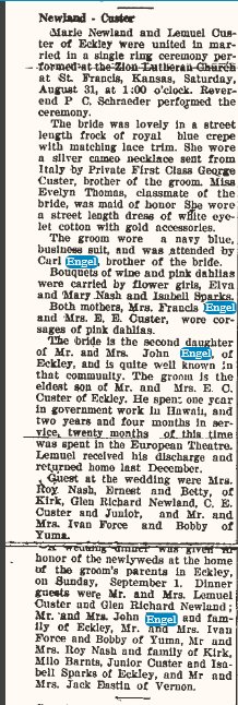 December 10, 1942 "Miss Marie Engel and Glen Newland of Yuma were married at St. Francis, Kansas, Saturday, November 14. Mrs. Engel and Mrs. Newland accompanied them."