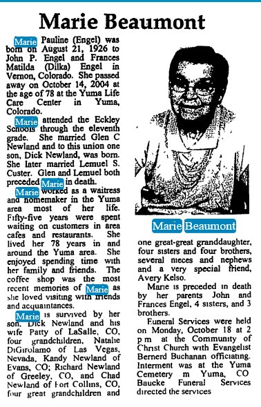 Marie Pauline Engel was born August 2, 1926, name Newland in 1944, Custer in 1949, Buaumont in 1972, dying Oct 14, 2004.