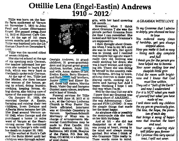 In 1900 Glendale precinct, Frederick Engle born April 1859, married 18 years to Otelia W June 1857., both born in Germany. She's had eleven children, two living. John P. Feb 1887 in Nebraska, and Frank Feb 1891 in Colorado. They're next to August and Anna Becker. (their homesteads touched, so their houses