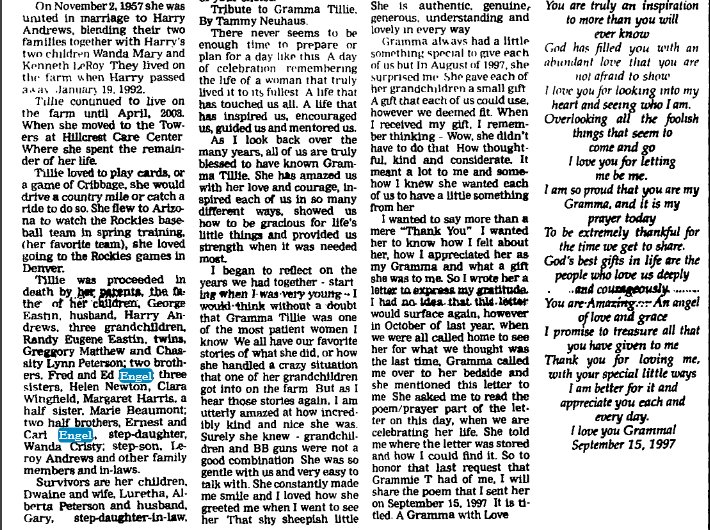 She is survived by daughter, Sue and husband, John Peterson of Poway, California: son Melbourne and wife, Connie of Longmont; daughter, Beverlee Eskew of Otis; 17 grandchildren, 30 great-grandchildren; five great-great-grandchildren and numerous nieces and nephews.