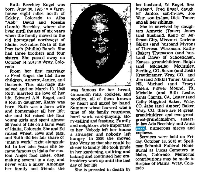 Ruth worked at the Engel Packing Plant for years. She also painted and papered with her sister, Bertha. She was devoted to family, farming and ranching with her husband. Dad always said Mom was the best hired hand he ever had.