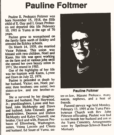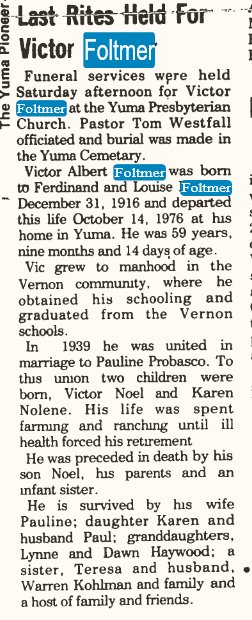 Victor is buried in Yuma, # 49689719, with Pauline 1918--1995 # 49689717.