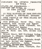 Decatur County, Iowa 1919 " Fred Hensley and family, Wray, Colorado, are visiting this week at the Wi11. Williams home."