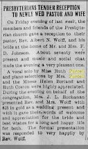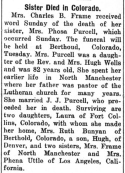 Miss Layton was born in North Manchester, on the first day of June, 1879. She was the granddaughter of the Rev. Hugh Wells, of sacred memory. Rev. Wells was the organizer of the Northern Indiana and Olive Branch Synods, and at one time actively associated in the operations of the General Synod. Miss Layton's father died when she was but a few months' old, and she was taken into the Wells home, where she remained until the death of her grandparents. Upon this breaking up of the old home, she came into the household of her uncle and aunt, Mr. and Mrs. Chas. B. Frame, where she was cared for as tenderly as a daughter. The departed was a member of Zion Lutheran church, and the funeral service was conducted by her pastor, Rev. Lloyd C. Douglas. |
