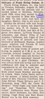 Frank E. Dodson is buried in Kirk # 67354419. His father Frank Ewing Dodson 1866-1939 is buried
