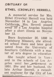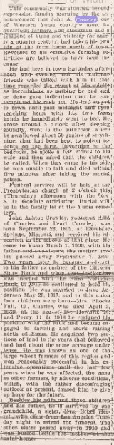 February 2, 1933 "Mrs. Ethel Herrell, who was called to Yuma by the death of her brother, John Crowley, left last Friday morning for her home in Los Angeles. Mrs. Herrell was a teacher in the local schools at one time and now holds a similar position in the California city."