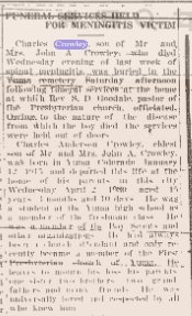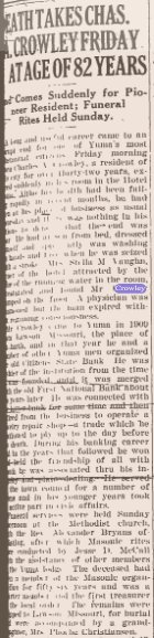1928 "Mrs. A.B. Herrell, of Los Angeles, who had been visiting with her father, Chas Crowley, of this city, and brother, John Crowley, north of Yuma, left Wednesday evening of last week for a visit with relatives at Fort Worth, Texas. Mrs. Herrell is a teacher in the junior high school in Los Angeles."
