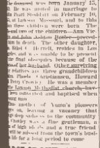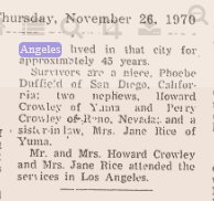 December 15, 1983 "Word has been received from San Diego California of the death of Harry Stender, husband of Jane Stender, on Sunday, Decemer 11. Mrs. Stender is the mother of Howard Crowley of Yuma, Phoebe Duffield of San Diego, and Perry Crowley of Reno, Nevada."