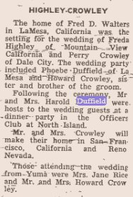 In 1975 San Diego, Mrs. Harold Duffield of La Mesa was an honor attendant "Mrs. Duffield is the daughter of the rformer Mrs. Rice." Her mother Jane Rice was marrying Harry Stender.