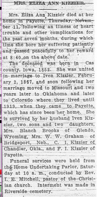 Ivin Kizzier, 84, died in Payette County, Idaho February 9, 1929, a retired farmer, husband of Eliza Ann Gobble.