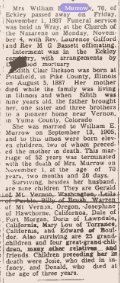 of Mt. Vernon, Oregon, Mrs. Josephine McCann of Hawthorne California, Mrs. Doris Mermin and Mrs. Mary Lou Moore of Torrance, California, Mr. and Mrs. Eddie Murrow Boulder, Mr. and Mrs. BillMuorrow and family of Brush, Mr. and Mrs. Dale Murrow of Ft. Morgan, Miss Nina Dickson, Mrs. Alta Whitman and Fred Murrow of Denver, and Mr. and Mrs. Ed Ramseier of Idalia."