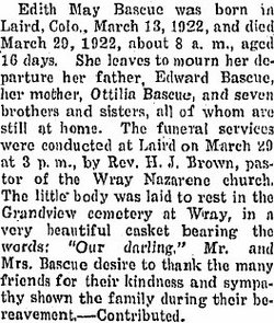 In 1920 Laird Edward and Othiley have Charley 11, Ruth G. 9, Velda V. 7, Wayne E. 6, Eva L. 3, and Darleen M. one month. The last three were born in Colorado, the others in Nebraska.