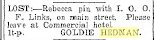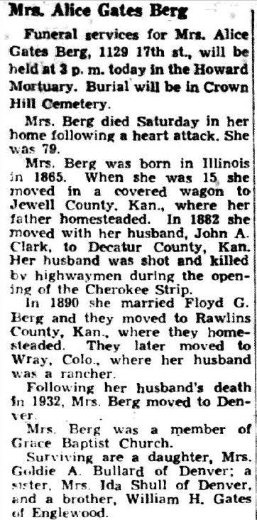 Mary Etta Drommond was born April 26, 1872. She married Charles A. Bullard June 8, 1898. To this union were born five children, two dying in infancy. Those living are Grace and Roscoe of Wray and Mrs Nettie Mae Benson of Golden, Co. Mrs. Bullard who had lived a large part of life in Wray and vicinity was one of God's noble women-mother,wife and frind unequalled by but a few. Her home life and social life was just of that character that establishes bulwachs for good, and leaves a lasting impression on the walks of life. She met her tragic death in Englewood last Saturday night when she was instantly killed by a truck. Mr. Bullard was with her at the time and sustained injuries as well. Beside her husband and three children she leaves two brothers in Wray, Earl and Roy Drommond, a sister Mrs. Walter Kearns of Laird, a siter Mrs. W.K.Fisk of Arvada and four other brothers-James of Denver, George and Alva of Laird and John of Pueblo. Thursday April 8, 1926 Colorado Patriot |