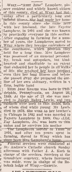 January 1915 "Mr. and Mrs. Fayette Lamphere, Jr., came down from Wray Tuesday,
