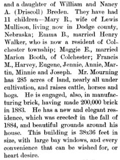 In 1880 McDonough County, Illinois, William Mourning is 48, Nancy A. 41, with Emma B. 18, Maggie E. 17, Marion F. 15, Harvey 13, Eugene 10, Jennie 9, Annie 6, Martin 4, and Minnie 1.