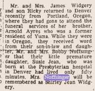 Lucille Isabelle Lafayette, 86, of Dallas died Thursday, Nov. 10, 2005, at the Dallas Retirement Center. She was born in Wray, Colorado May 31, 1919, the daughter of Orville and Vera Lott Noffsinger. She moved to Ladvele, Colo., and married Joe Coffey. They had a son, Jim. She moved to Lebanon in 1942. In 1954, she married Erman J. Lafayette and they were married 23 years before they divorced. They had two sons, Julian and Mark. She worked for Scoville Real Estate from 1964 to 1969 in Brownsville and then got her own real estate license in the early 1970s. They moved to the Holley area of Sweet Home in 1976, where they owned a farm. Lucille’s brother, Lloyd, was a real estate broker and they worked together as partners for many years. She did tax consulting for many years while she was a real estate broker. Her son, Julian, took over the farm in 1990 and Lucille continued to help with the books. She stayed with Julian two days a week in Rickreall until 1997. In 1997, she moved to Dallas and retired in 1998. She was a member of the Sweet Home and Dallas Christian Missionary Alliance Churches. She enjoyed accounting, tax consulting, yard and garden work and being with her grandchildren. She is survived by sons Julian Lafayette of Rickreall and Mark Lafayette of Madras; sister Josey Homedew of North Bend; six grandchildren, and one great-granddaughter. She was preceded in death by son Jim Coffey in 2004; a granddaughter in 2001, and siblings Cordelia (Corky) Walker, Ruby Marlene Swanson, Opal Bowes, Lloyd E. Noffsinger, Harold Orval Noffsinger, H. Lavern (Phil) Noffsinger and Bernice A. Laux. Viewing will be from 1 to 6 p.m. Tuesday at the Dallas Mortuary Tribute Center. A funeral service will be at 11 a.m. Wednesday at the Crawfordsville Community Church. Vault interment will follow at the Lebanon IOOF Cemetery. |
