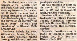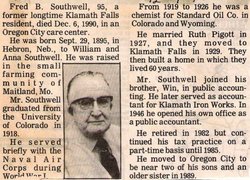Mary Patterson was born in Mansfield, England, April 4, 1850 and died at her home near Republic, Kansas, on Monday morning, May 16,1892 at 12:40 aged 41 years, 1 month and 12 days. The deceased, when very small came to America with her parents who resided at St Louis, Mo., for awhile, thence removed to Marysville, MO where she became the wife of J.T Patterson on the 15th of February, While at Marysville the grim monster, death, entered this happy home and took from them a little two year old girl the pride, of the household. A number of years ago she. with her husband, came to Republic county, Kansas, settling near Republic City, where they have lived ever since. She leaves a loving husband and five children to mourn her loss, two other children having preceeded her to the land of eternal rest. In the death of Mrs. Patterson the husband loses a fond and loving helpmate, and the children an ever patient and devoted mother. She was a consistent member of the M.E. Church, and was beloved and highly respected by all who knew her. The funeral services were conducted under the auspices of the Odd Fellows of that place, of which Mr. Patterson was a staunch and worthy member. They formed in town headed by the Noble grand, D. A. Davie's. and drove to the house, where, after a sermon preached by Rev. Kerr, of Warwick, with open ranks the pall bearers, followed by the chief mourners passed down the long lines on their way to the Lake Cemetery where she was laid to rest. The Telescope extends sympathy to the bereaved family and friends of the deceased. FindaGrave # 107938492. WILLIAM G. William G. Southwell 1865-1934 is buried in Maitland, Missouri # 132758371. One of the leading contractors and builders of Holt County, Missouri was W.G. Southwell, an Illinoisan by birth, but raised in Maryville, Missouri, where he began his trade. He was associated with Win Wood, of Hebron, Nebraska, for a number of years and married Anna E. Heskett on May 12, 1886. They lived in Hebron after their marriage and five children were born; Harry Burton, William Winton, Rebecca Fay, Harry Linn, and Fred Bryan. Harry Burton and Harry Linn died at the ages of five and three, respectively. In 1895 they moved to Maitland when Mr. Southwell worked the first winter on the Broad Gage, then under construction. The next year he bought the Southwell home one block north on Main Street and lived there with his family until 1919 when he and Mrs. Southwell and grandmother Burke moved into their apartment over the office building he had erected on the site of the old Commercial Hotel. Here they resided until his death on July 9, 1934. The following winter Mrs. Southwell moved to Omaha to live with Fay, a teacher there in North High School. The home was not sold until several years later, and was eventually sold to Ralph Dysart. Mr. Southwell built many of the homes and public building in and around Maitland, among which are the Presbyterian Church, the floral hall on the fair grounds, and the Fleming house south of Graham. Win Southwell married Jennie Metcalf and was a certified public accountant at Klamath Falls, Oregon. Fred Southwell married Ruth Plodgett and they too, lived at Klamatha Falls, Oregon. They had Winifred Southwell on November 4, 1920 in Klamath Falls, Oregon. They had Margery Ann Southwell in 1924, who married Lewis Angle Hammers on April 11, 1942 in Benton County, Oregon. "In a simple ceremony read at the home of her parents, Miss Margery Anne Southwell, daughter of Mr. and Mrs. Winton W. Southwell of Summers lane, became the bride of Mr. Lewi A. Hammer on Saturday morning, April the eleventh, at ten o'clock. The Rev. Victor Phillip of the First Methodist presiding. Vows were exchanged before the living room fireplace banked with pink and white cherry blossoms, white stock and graceful ferns. Just before the ceremony Mr. Fred Southwell, uncle of the bride, sang "Margie" and . "Sweetheart of ATO." The bride, given in marriage by her father, was lovely in a frock of white sheer wool jersey fashioned with draped bodice, full short skirt and three quarters sleeves. She wore a white orchid in her hair. Mrs. James Stllwell, (Winifred Southwell), was her sister's only attendant. She wore yellow sheer wool frock of Jersey with high neckline, fitted bodice and full skirt. She wore yellow spray orchids in her hair. Mr. Stanley Czech of Harvey, Illinois, fraternity brother of the groom, was best man. Mrs. Elbert S. Veatch played Mendlessohn's wedding march as the bride entered the room. Immediately after the ceremony a reception was held on the porch where the bride cut her cake. The table was prettily appointed with pink rosebuds and maiden hair fern. Mrs. Stilwell served the cake and Mrs. Fred Southwell presided at the coffee urn. Early Saturday the young couple left for Portland to remain for a brief time before the bride resumed her teaching position at Rogue River high school, and the groom returned to his studies at Oregon State college. He will be graduated this June and enter the army as a second lieutenant. The bride is a popular member of the younger set, a graduate of Oregon State college where she was a member of Delta Delta Delta sorority. The groom, son of Mr. and Mrs. J. R. Hammers Sr.. of Harvey, is affiliated with Alpha Tau Omega fraternity and has played on the Beaver varsity football team for several years." "Margery was born on November 8, 1919 and passed away on Tuesday, October 6, 2015. Margery was a resident of Tucson, Arizona." March 15, 1942 "Of interest is the announcement of the marriage of Miss Winifred Southwell, younger daughter of Mr. and Mrs. W. W. Southwell of Summers lane, who became the bride of Mr. James Stilwell, son of Mr, and Mrs. F, W. Stilwell of Bty. The ceremony was read at six o'clock Saturday evening, March the seventh, in the First Methodist church with the Rev. Dorlcw Johnson officiating. On Monday Mr. Stilwell left for Portland where he will enter the service of the United State