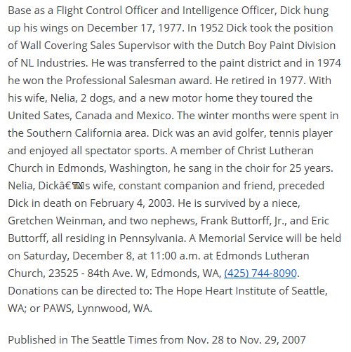 She was born February 17, 1916 at McCook, NB. She graduated from high school on June 4, 1934. She moved to Los Angeles, CA and lived with an older sister, Sue. She met her husband to be, Richard Buttorff, at a U.S.O. sponsored dance in Tulare, CA, where Richard was attending Rankin Aeronautical Academy as an Aviation Cadet. They married at Roswell, NM on October 27, 1943. They lived in their Edmonds home since 1957.
