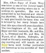April 1911 McCook "Mrs. Albert Styer of Wray, Colorado was in town Sturday shaking hands with old acquaintances."