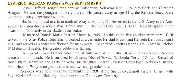 Lester Hougan's 1998 obituary said that his sister Elma Haun of Wray survived.
