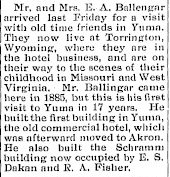 The family has a nice history: Eugene A. Bellingar was a lumberman in his early years. By 1880, he was working as a carpenter at Muskegon, Michigan. About 1886, he homesteaded at Yuma, Colorado where his sister Minnie Davanon had settled several years earlier. He sent for his wife and children shortly afterwards. Eugene assisted in the construction of the first buildings in Yuma, including the first church. Several years later his wife Ida came down with a fever and died suddenly, leaving him with three small daughters to raise. As he was unable to care for them, he took them back to Michigan and placed them in the homes of relatives. Maud lived with her aunt Mary Pierce Henderson at Holton, Michigan; while Stella lived with her grandmother Elisabeth Bellingar at Muskegon, Michigan. Mina lived with ?] Eugene returned to Yuma and continued with his contracting and carpentry business. In 1891, Eugene was married to Kate Neal who lived with her daughter Nora on an adjoining homestead. Eugene's daughters returned from Michigan though Maud and Mina eventually returned to Michigan where they married. Later Eugene and Kate moved to York, Nebraska but the hot winds and grasshopper plague forced them to leave. The family moved to Clinton, Missouri in about 1896 and remained there until 1909, when they moved to Torrington, Wyoming. Eugene and Kate operated a hotel there until 1911 when they moved to Morrill, Nebraska and purchased the Morrill Hotel. In 1940 Morrill, Edward D. Sayre is 48, Ksthleen Sayre 43 Wife, Carolyn Sayre 8 Daughter, and Kate Bellinger 87 Mother is widowed. Esther M. and James Pierce's daughter Mary is buried in Poplar Hill Cemetery, Allegan County, Michigan 1862-1926 # 39324845. Her death certificate says she was the daughter of James Pierce born in England and Esther M. Eggleston born in Ohio. |