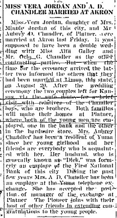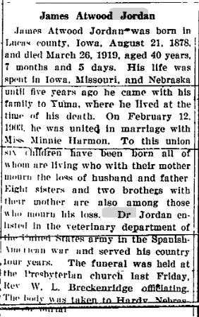 April 1915 "Mr. and Mrs. James Jordan arrived from Superior, Nebr., last Sunday,