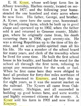 Adelbert proved up a quarter in Harlan County in 1884. So did George and Edwin H. Kyser.
