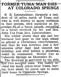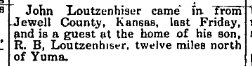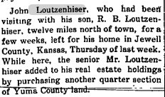 May 4, 1917 "R.B. Loutzenhiser, who recently purchased the Cook farm, some twelve miles north of Yuma, came in Tuesday with his family from Jewell, Kansas, and has moved out to their new home."