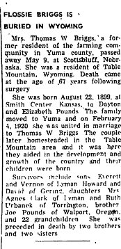 Flossie Belle Pounds born Sept 24, 1898, died in Multnomah County July 5, 1983. Her mother was Lucy Minette (Deppen) Horsman 1861-1936 buried in Kirwin Kansas 51307184.