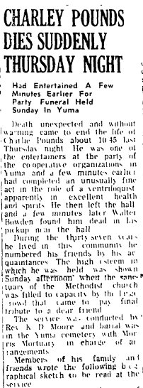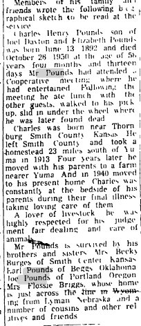 Charlie signed a WWI draft registration card June 5, 1917 at Yuma, Colorado giving his date of birth as June 13, 1891. Born at Smith Center, Kansas. Description: age 26, single, medium height, medium build, grey eyes, brown hair. He was living at Cope, Colorado where he was farming. Signed: Charles Henry Pounds.