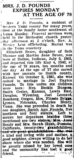 In 1920 Yuma County, Joe D. is 60, Elizabeth 56 Indiana, Charles Henry 28 and Flossie Elizabeth 20 both born in Kansas.