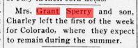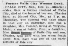 1907 "Tom Sare was in town this week visiting his daughter, Mrs. Grant Spery, on his way from Mound City, Mo., to his home in COlorado."