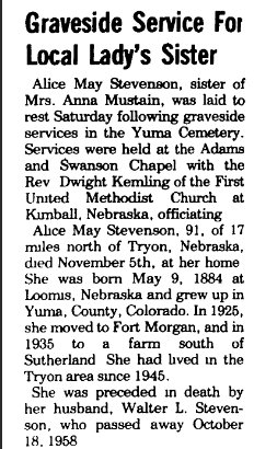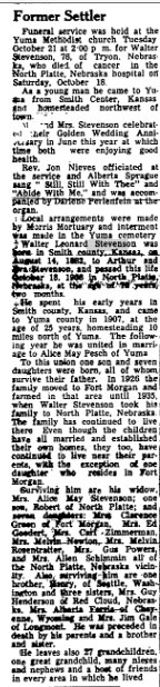 "Mrs. Walter Stevenson of Tryon, Nebraska, came to Yuma on Tuesday to attend the funeral of her husband and remained to spend the rest of the week with her sisters, Mrs. L.A. Mustain and Mrs. Mary Deering."