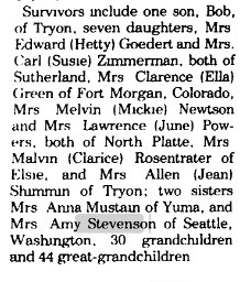 In addition to her parents, Clarice was preceded in death by four sisters, Hetty Goedert, Susie Zimmerman, Ella Green and Mickey Newtson; one brother, Bob Stevenson; one son Dan Rosentrater and one grandson, Troy Rosentrater.