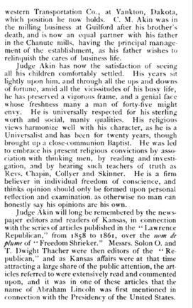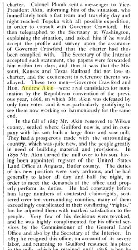 "Andrew Aiken, a prominent pioneer of Kansas, and once register of the land otlice at Topeka, died at Omaha. Neb., aged Mr. Aiken was very prominent in the early political history of Kansas."