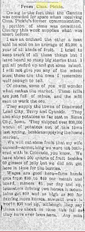 July 1904 "Chas. Pickle, the Vernon iron moulder, was in town last Friday and shied a dollar into the right spot.: