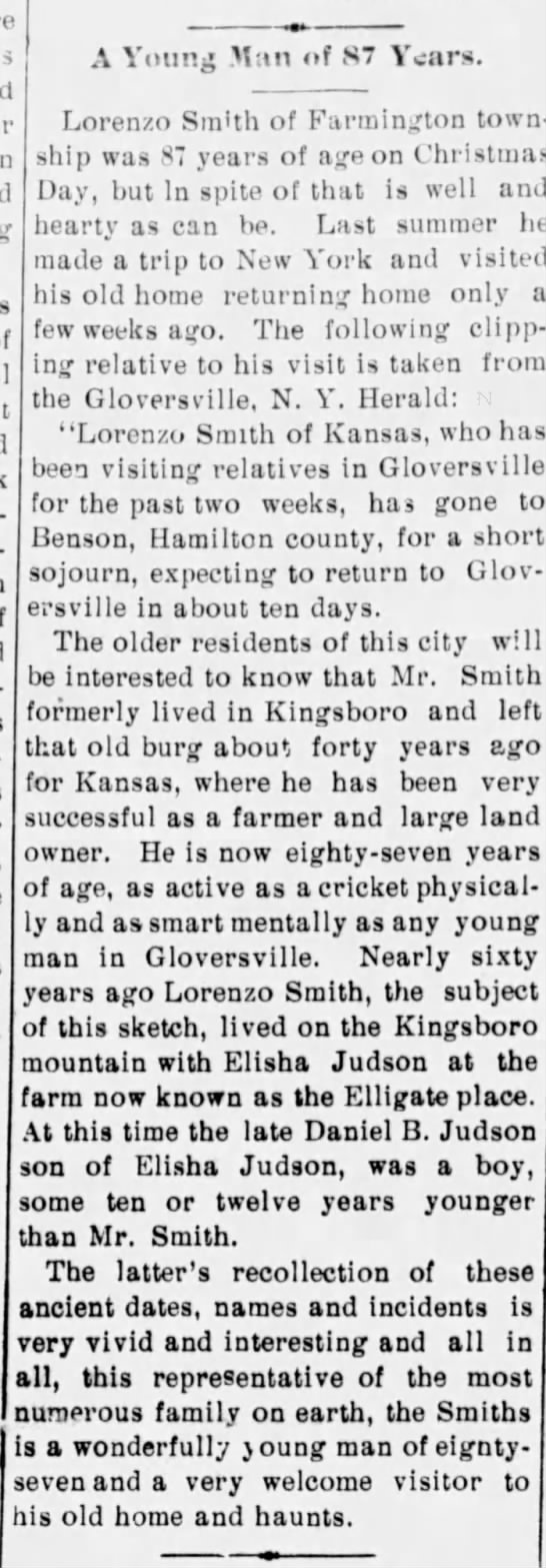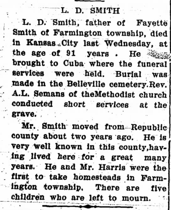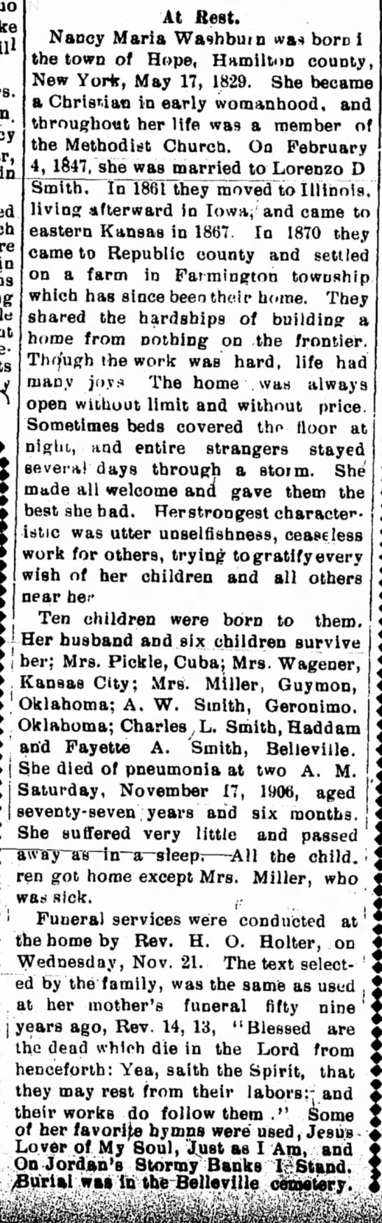 Lorenzo Dow Smith 1820-1911 is buried in Belleville, Kansas # 119895360, with Nancy Maria Smith 1829-1906.